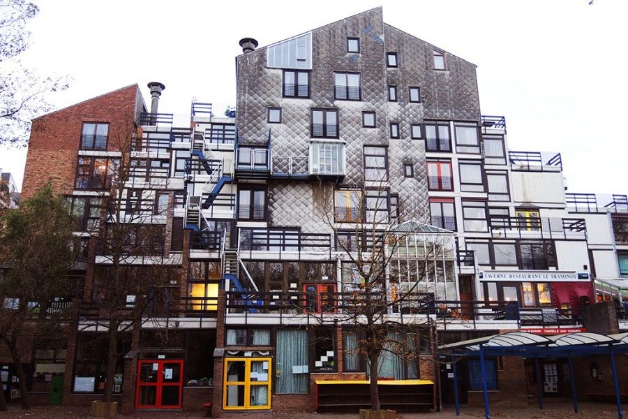 At the same time in 1968 just next door the student town with the university and university buildings, laboratory etc. was built. The architect chosen for this at the time was Lucien Kroll, a proponent of participatory architecture. He built the campus working with the students over the course of very long design workshops. The whole project has become a sort of model today, a unique example of this type of architecture, which is in the process of being designated a Belgian heritage site.