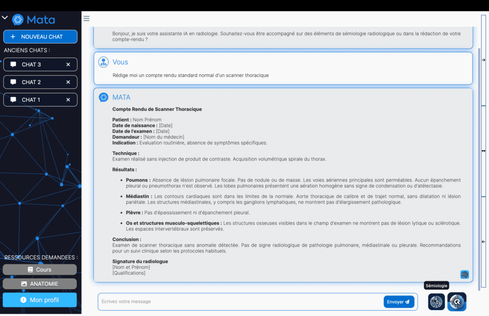 Beyond its clinical functionalities, Mata is designed as a support tool for the ongoing education of medical professionals. Recognizing the importance of lifelong learning in medicine, the platform offers a forthcoming Course Module. This resource will feature expert-led lessons by renowned university professors and hospital practitioners, providing a rich repository of knowledge for radiologists, interns, and technicians.